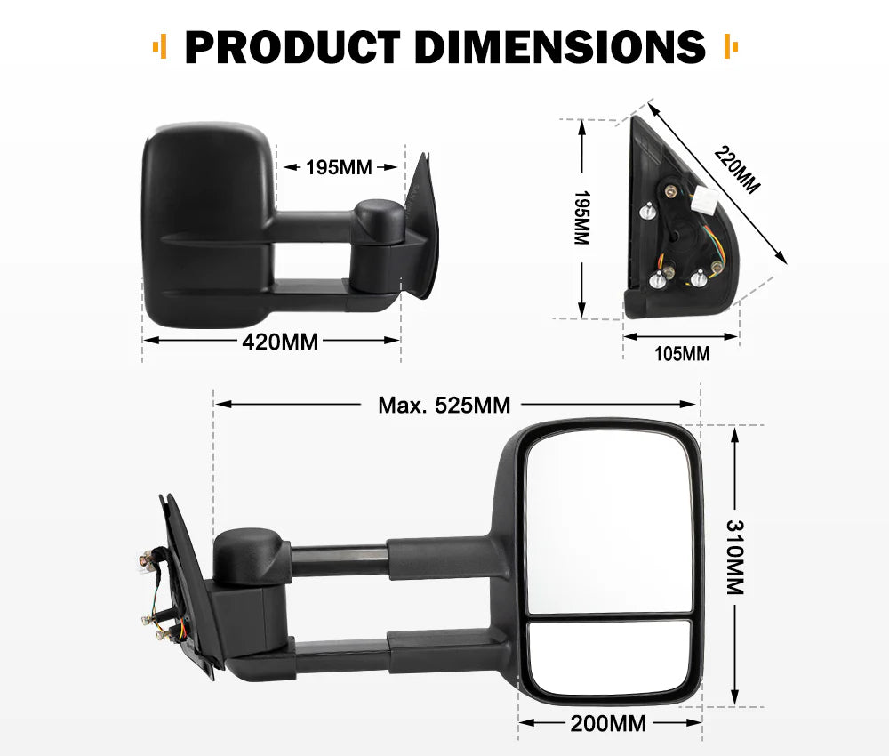 • Extended Reach: Our side mirrors slide out an additional 105mm and extend a total of 525mm from your car door, giving you maximum visibility.