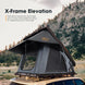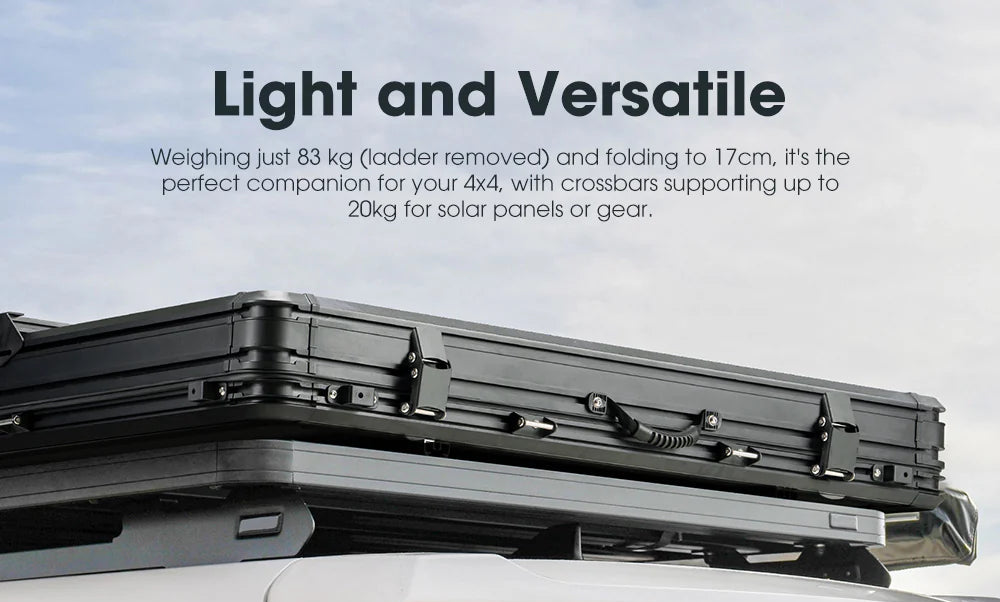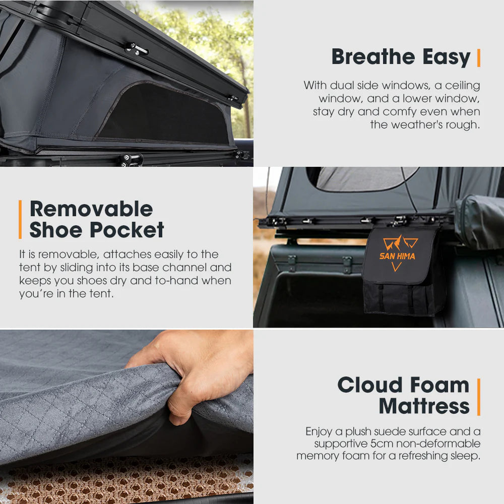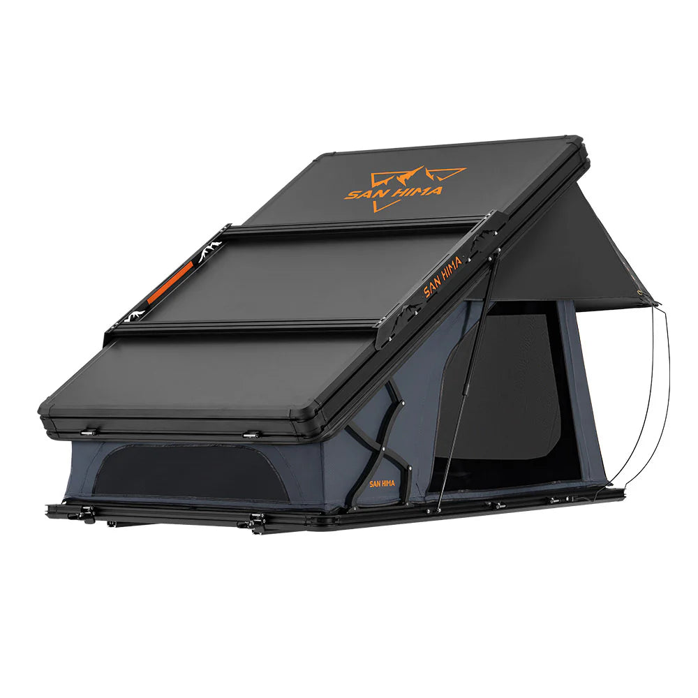 Fuelled by a passion for exploring wild terrains, the San Hima Kalbarri X Rooftop Tent is designed to enhance your comfort on every adventure. Its smart X-arm construction delivers added rear headroom, so no matter where you go, you can be assured that your comfort is always close by. Featuring raised X-arm construction, the Kalbarri X rooftop tent provides generous rear headroom, delivering not only ample head space but also exceptional ventilation. Made from durable 420D Oxford Fabric and 280GT poly-cotton, this camping rooftop tent features 5,000mm waterproofing and UV 50+ protection, ensuring resilience in harsh conditions. Inside, enjoy a spacious 201x125cm area with a plush 5cm foam mattress and an anti-condensation mat for a great night's sleep. The thoughtfully designed ventilation system—including dual side windows, a ceiling window, and a lower window—keeps the air fresh and minimizes condensation. Discover the ultimate in comfort with the San Hima Kalbarri X!