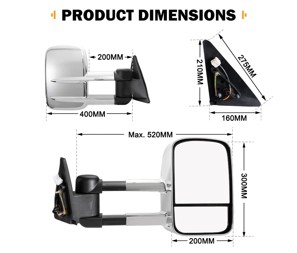 It can be mentally demanding towing a caravan or camper trailer. The factory mirror, however, may be blocked by the caravan, which can cause serious accidents. This side mirror is our offering to Toyota Land Cruiser 100, 1998-2007. This extendable side towing mirror is designed as a perfect fitment and is supplied with instructions for quick installation. Two types of mirrors on these car mirrors are also incorporated to provide crucial visuals for your driving safety. The larger electric flat mirror provides clear vision down the side of your camper or caravan. The lower convex mirror eliminates blind spots and provides a better vision within the lanes near your vehicle. Made of tough ABS housing and aluminum base, this towing mirror is equipped with all-weather performance against harsh road conditions. Once fitted this rear view mirror will extend an additional 105mm and a total of 520mm outward from your car door, extending the vision range to keep you safe when towing.