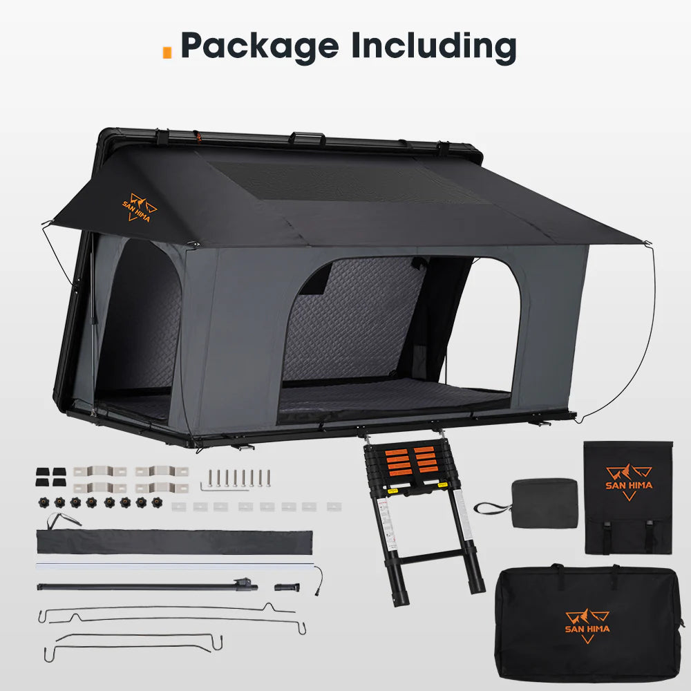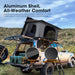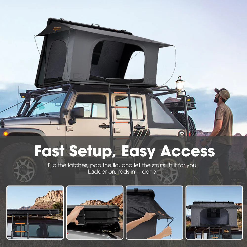 • Fast Setup, Easy Access: Flip the latches, lift the lid, and let the gas struts take over. Hook the telescopic ladder (150 kg rated), add window rods, and you’re ready.