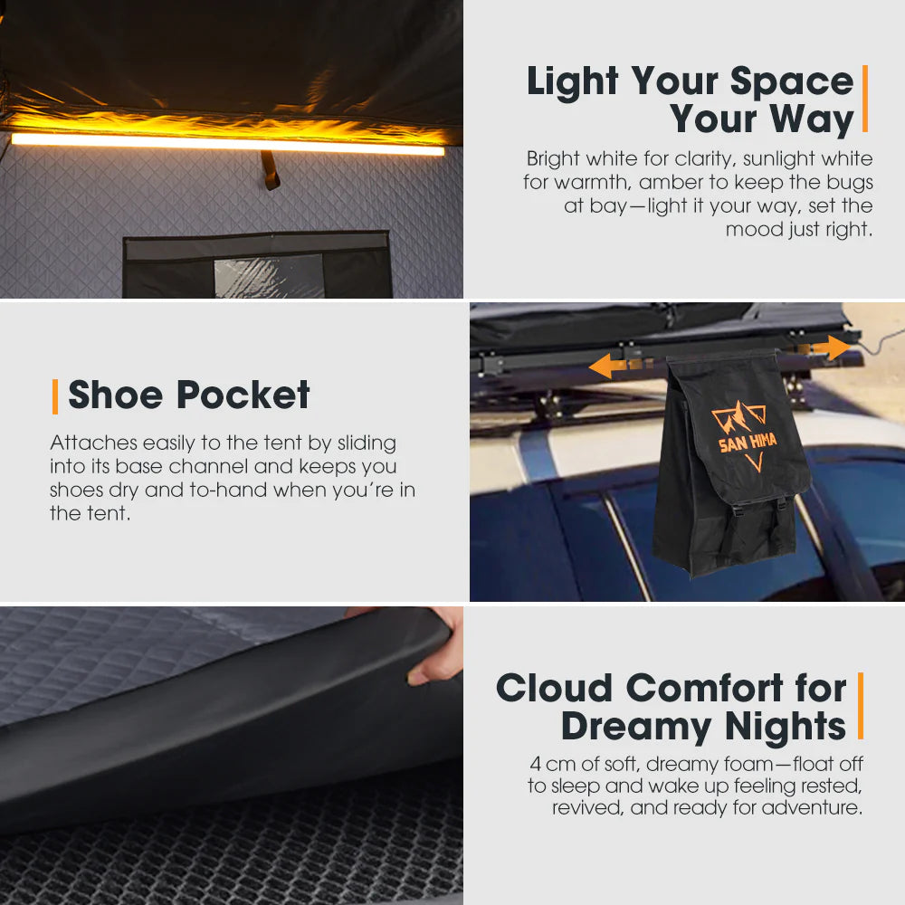 It’s that time of day—the sky’s starting glowing, and fireflies are twinkling. And you? You’re right there, lying back in your Kalbarri Side rooftop tent. With the wild right outside and all the coziness you need inside, it’s the best of both worlds—close to nature, without sacrificing comfort. At just 66 kg and only 11.5 cm thick when packed, this rooftop tent fits easily into garage or undercover parking. The materials are made to go the distance—420D Oxford polyester and 280G poly-cotton canvas—waterproof to 5,000mm, UV50+ rated, and mold-resistant. Once you’ve set it up, it opens into a roomy interior with 206 x 152 cm of floor space and 124 cm of headroom. The side-opening design gives it an airy feel, and the skyview window makes you feel part of the landscape. Inside, a 4 cm cloud foam mattress cushions you in comfort. And when night falls, the tri-color LED light bar lets you set the mood. Wherever you park, you’ll sleep soundly, wrapped in comfort and cradled by nature.