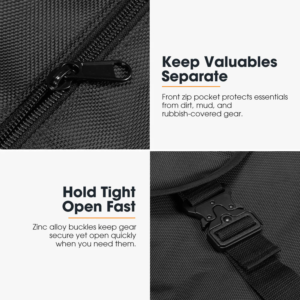 • Zippered Front Storage: A front zipped pocket keeps your smaller or valuable items separate from muddy gear—no more mess mixing with the rest.